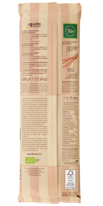 ельнозерновые спагетти Libera Terra производятся из твёрдой пшеницы, выращенной устойчивыми методами и бережно обработанной, чтобы сохранить аромат, питательные вещества и природную чистоту. Они богаты клетчаткой и изготовлены из высококачественной цельнозерновой семолины, имеют аутентичный, насыщенный и слегка «деревенский» вкус. Бронзовое прессование и медленное сушение при низкой температуре обеспечивают отличную консистенцию и идеальную устойчивость при варке. Подходят для любых соусов — от простых средиземноморских до самых творческих.
