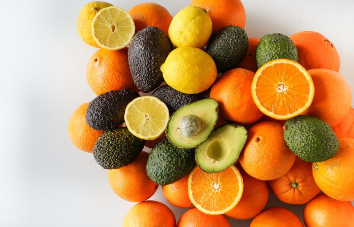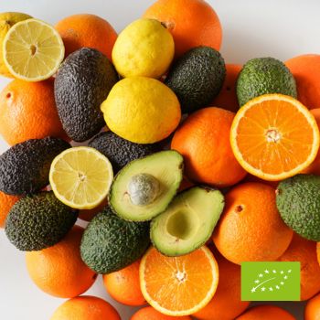 Kaste satur organisko citronu maisiņu 2 kg, organisko avokado Hass maisiņu 2 kg, bet pārpalikušu vietu aizpildīja organiskie apelsīni Lane Late 7,5 kg.
