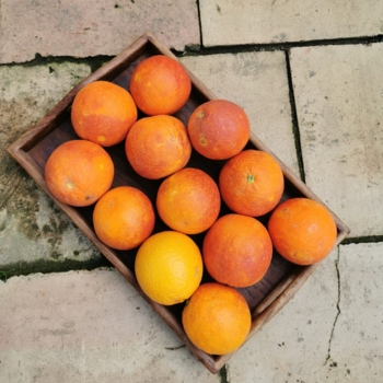 Kastē ir 4 kg organisko apelsīnu. Tarocco Rosso ir Sicīlijā populārās apelsīnu šķirnes Tarocco apakššķirne. To raksturo skaisti iekrāsota miza ar sarkanoranžīgiem toņiem un intensīvi iekrāsota mīkstuma, kas pēc izskata ir ļoti līdzīgs Moro šķirnei. Apelsīniem ir salīdzinoši plāna miza, un tie ir ļoti mīksti uz tausti (tiem nav stingras struktūras). Koks ražo vidēja un maza izmēra augļus. Ražas novākšanas laiks ir no decembra beigām līdz februāra beigām.